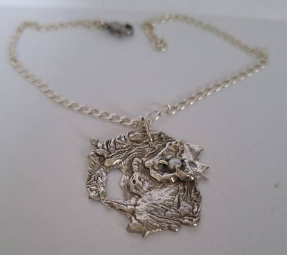 Geheel zilveren hanger met een zoetwaterparel erin verwerkt. Unieke fantasievorm .