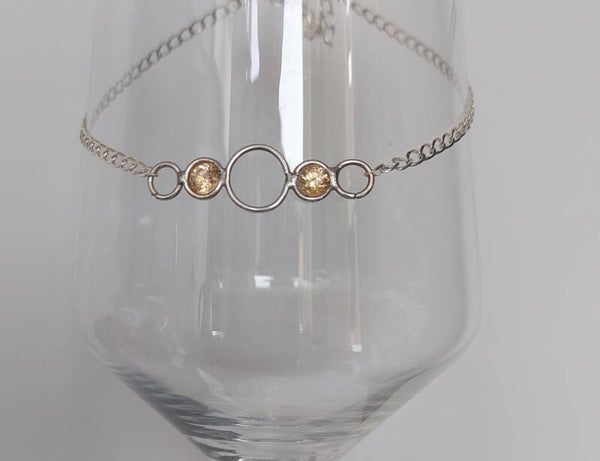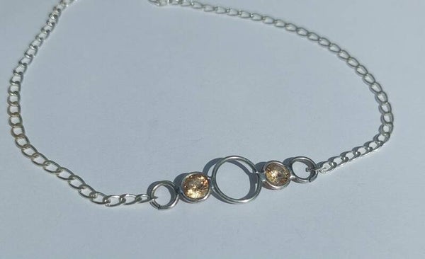 Zilveren enkelbandje met grote champagne kleurige zirconia's erin verwerkt. Zomers bandje wat ook goed als armbandje kan. Ik maak hem nog op de juiste maat.