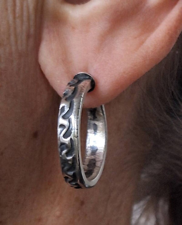 Zilveren oorringen met een robuust motief.