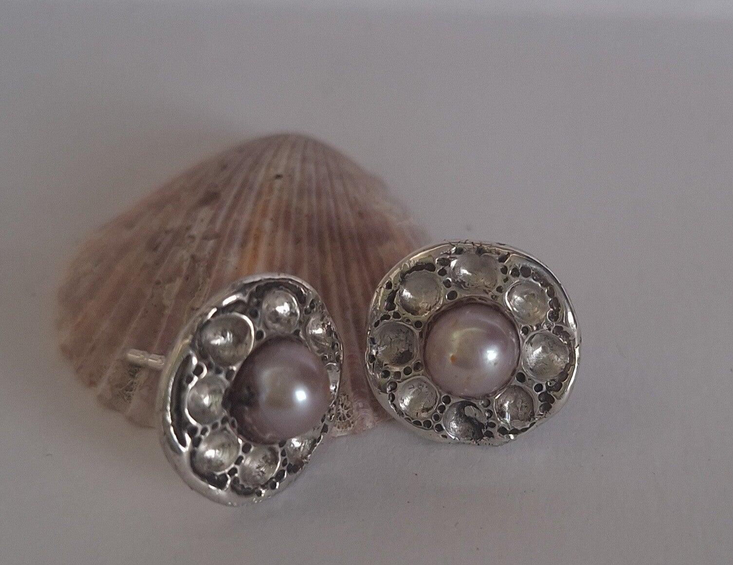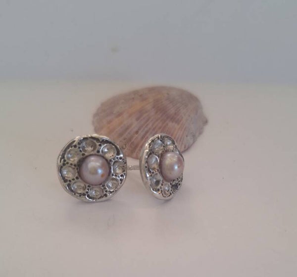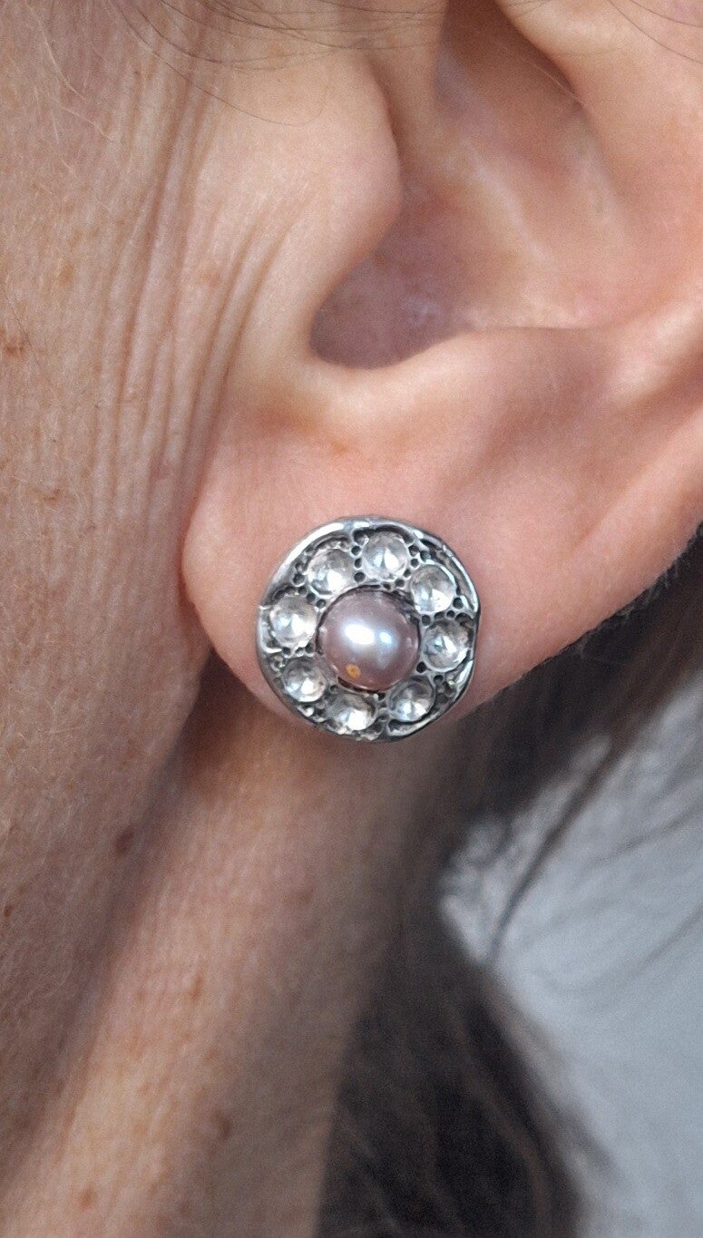 Zilveren oorbellen met een echte roze zoetwaterparel erin verwerkt.