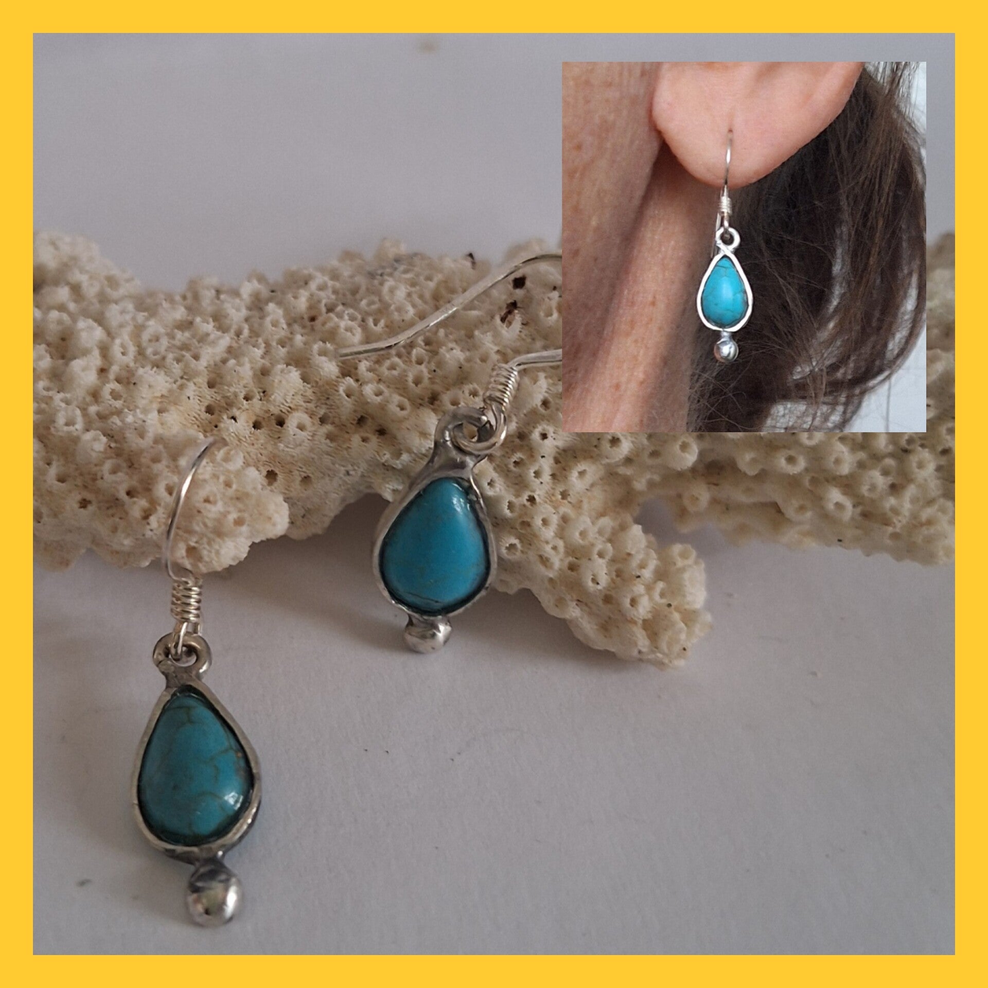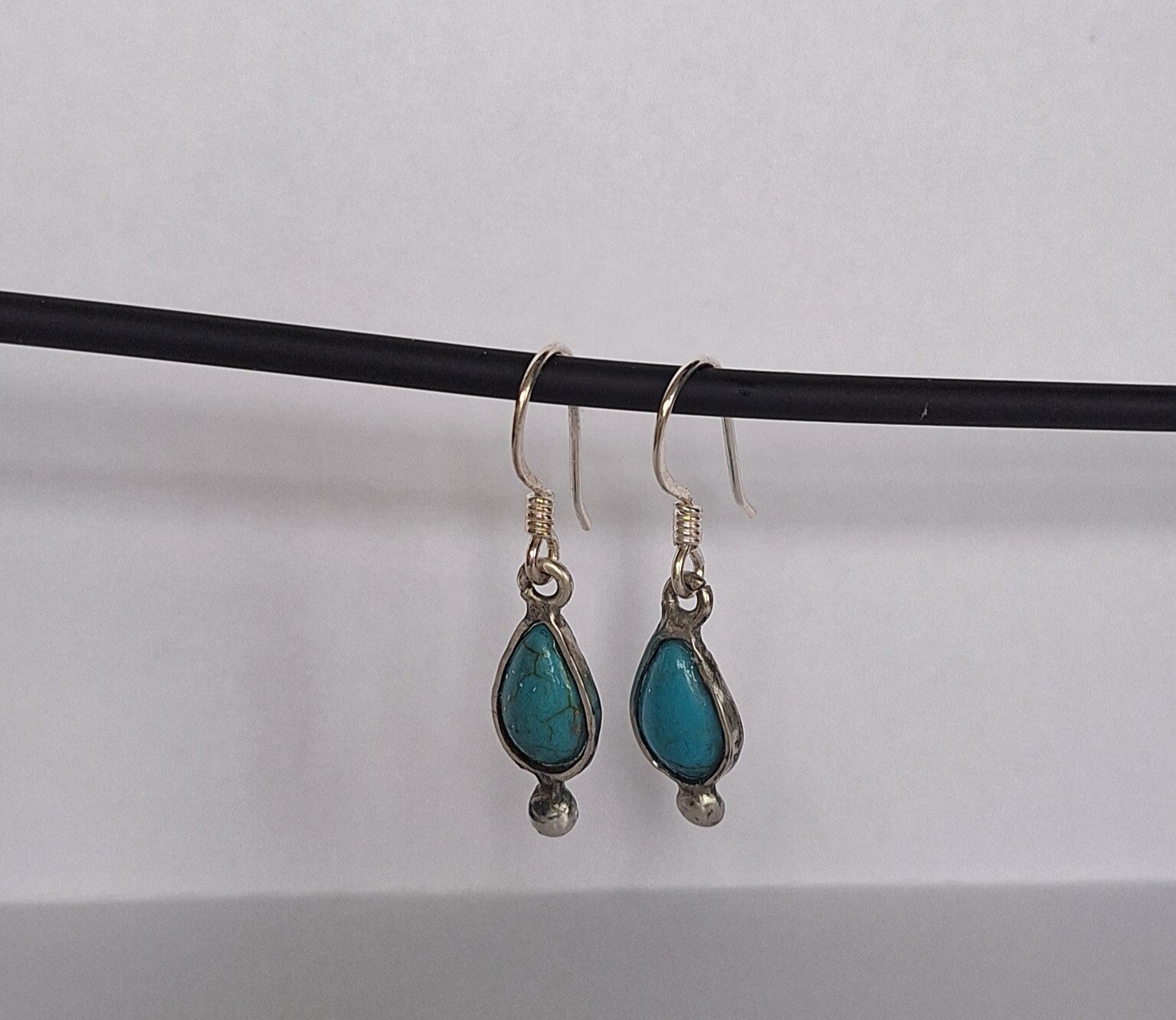 Zilveren oorhangers met turquoise kleurige druppel vormige steentjes erin.