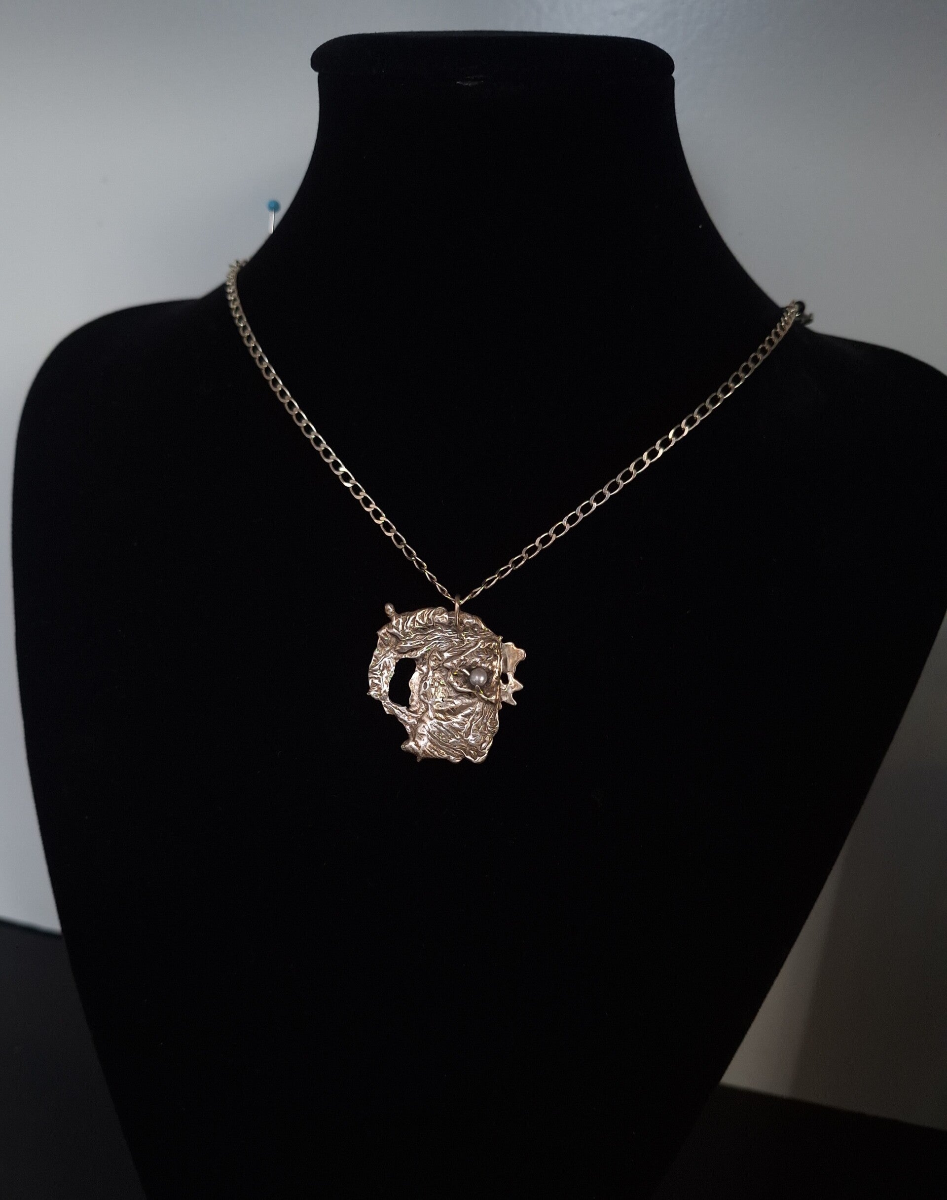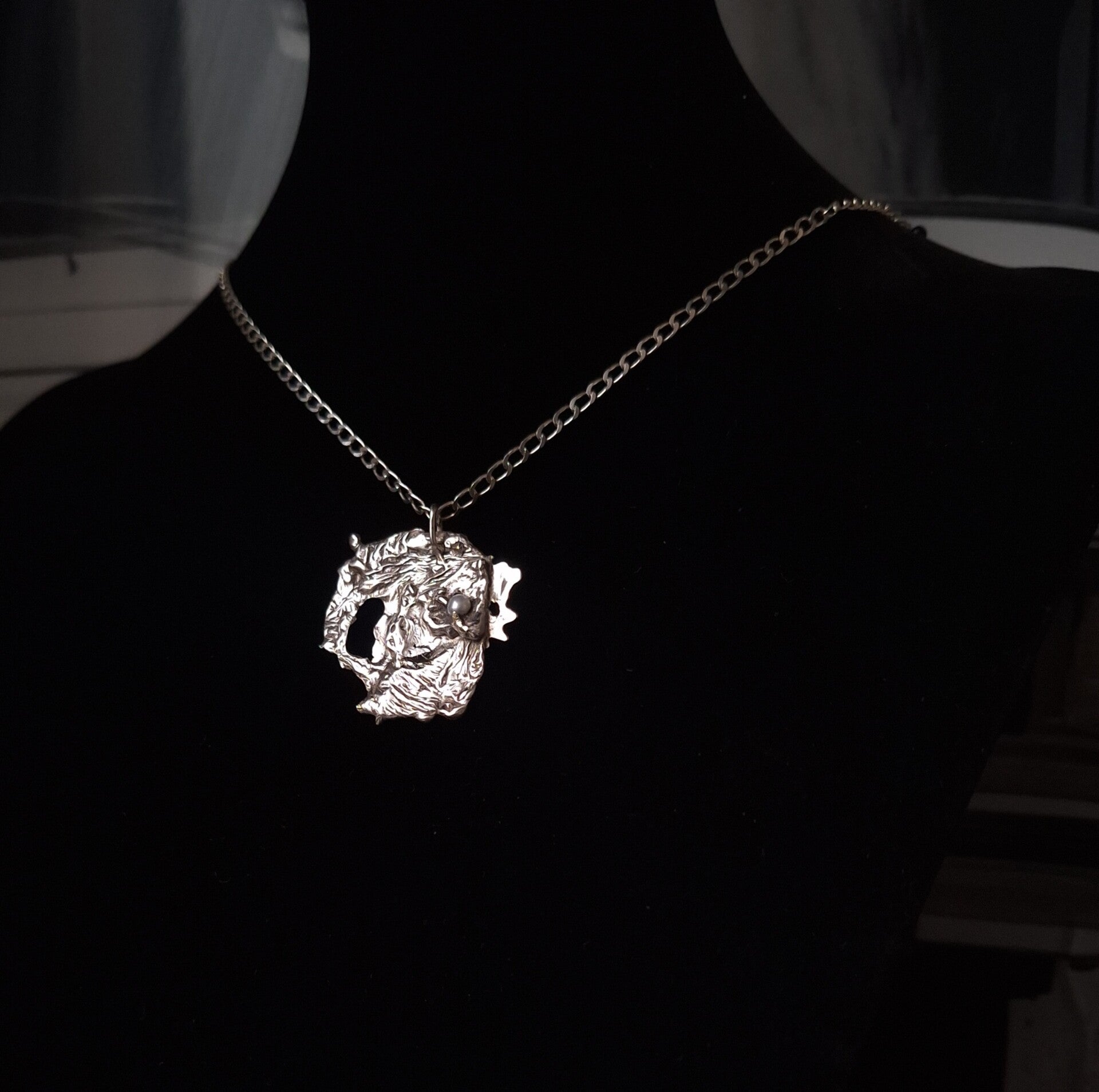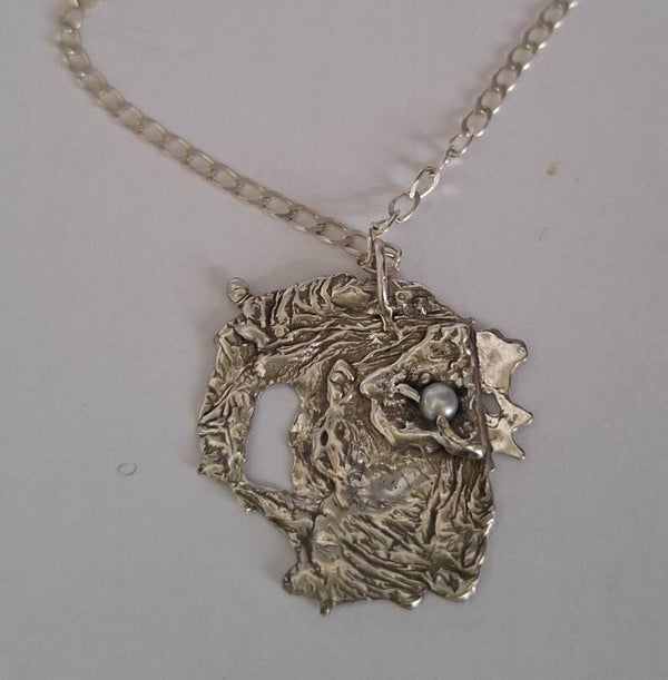 Geheel zilveren hanger met een zoetwaterparel erin verwerkt. Unieke fantasievorm .