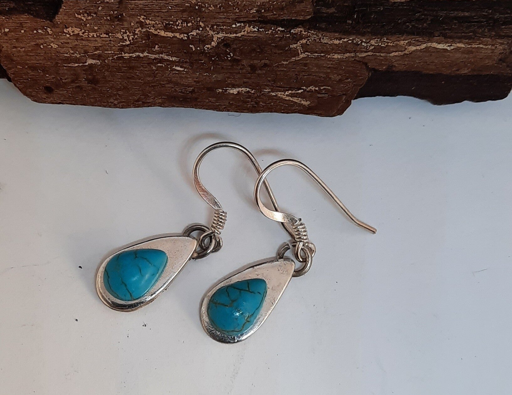 Zilveren oorhangers met een zilveren bedeltje met turquoise kleurige steentjes erop.
