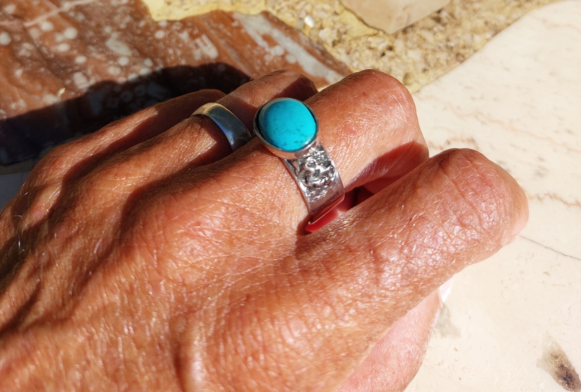 Zilveren ring met grote echte turkoois erin verwerkt. De breedte is 5mm en de ringmaat 19.5 mm