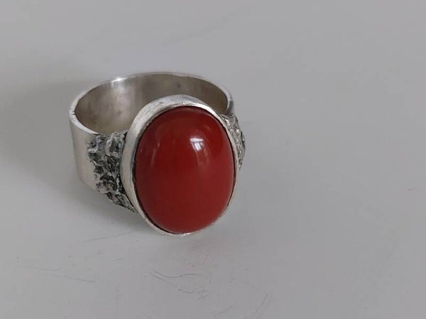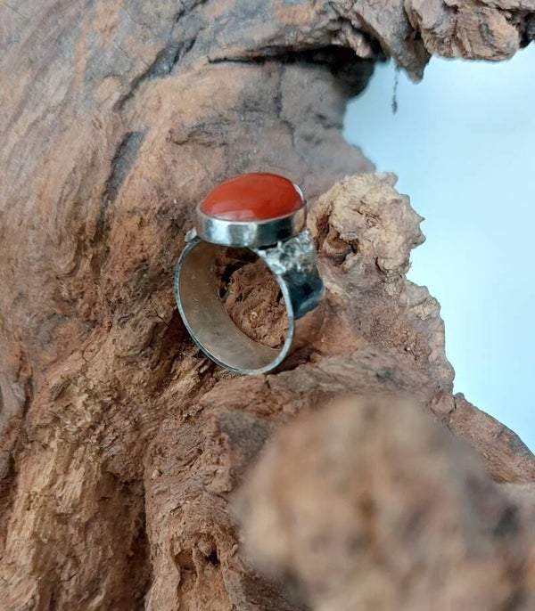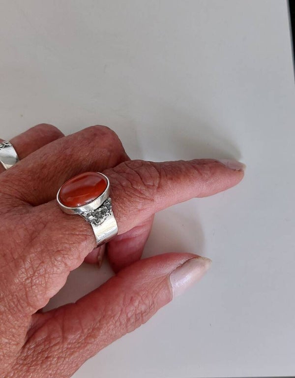 Deze brede zilveren ring bevat een grote rode Jaspis steen. Jaspis werkt aardend en beschermend. De steen maakt strijdlustig, daadkrachtig, volhardend vastberaden en ergens vollefig voor te gaan.