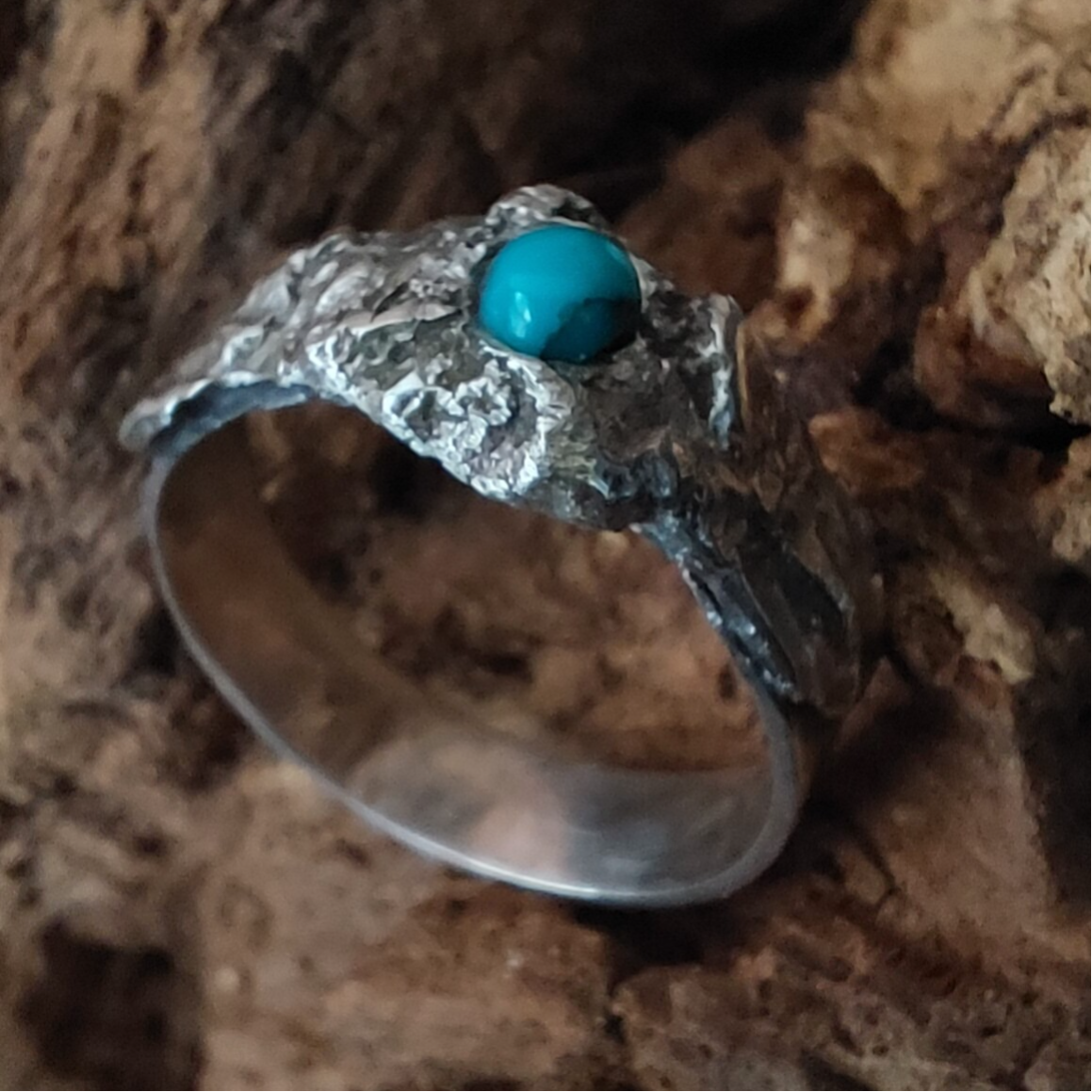 Silver ring with a rough look. There is a small real turquoise on top of it. Size is 19.5mm