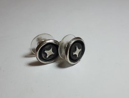 Zilveren oorbellen met een zwarte steen erin verwerkt.