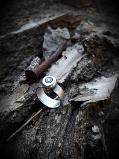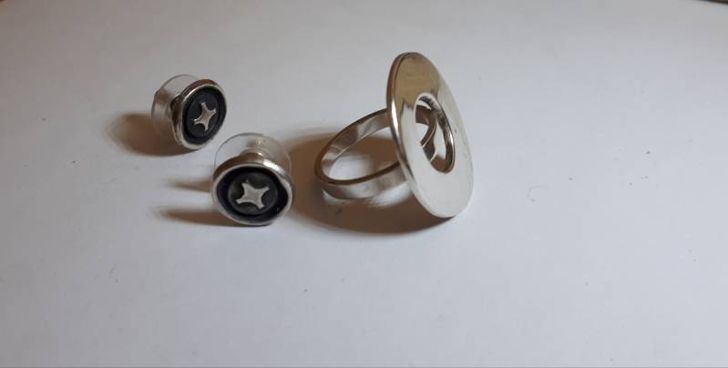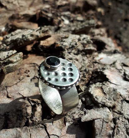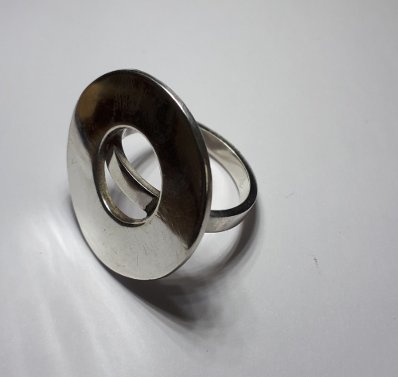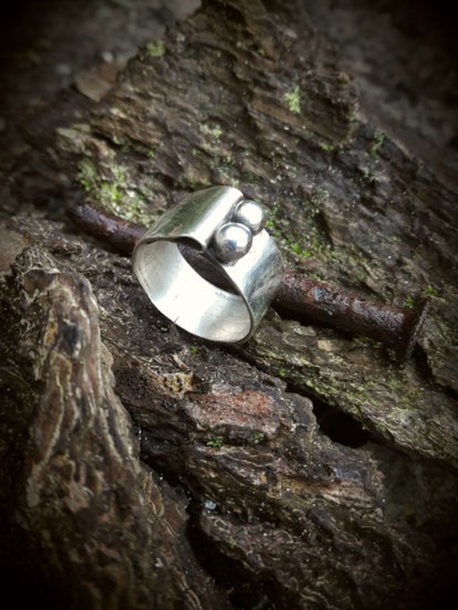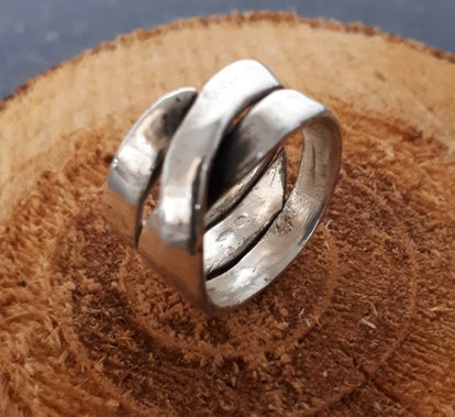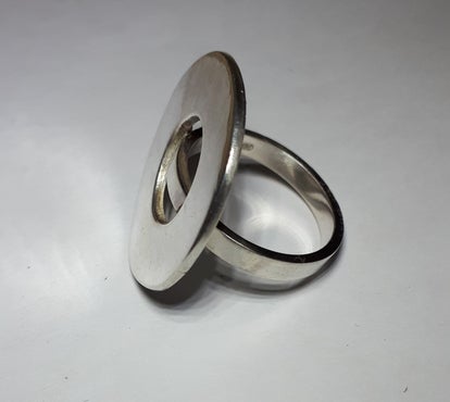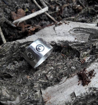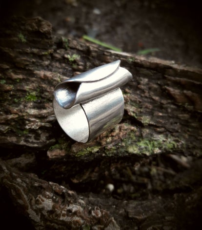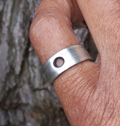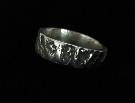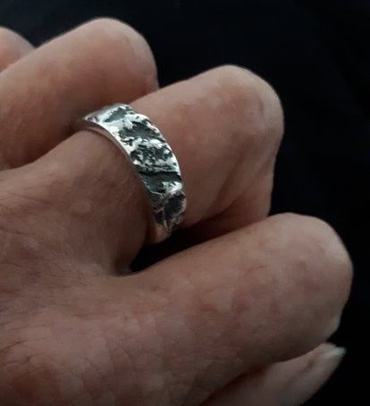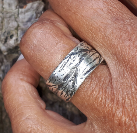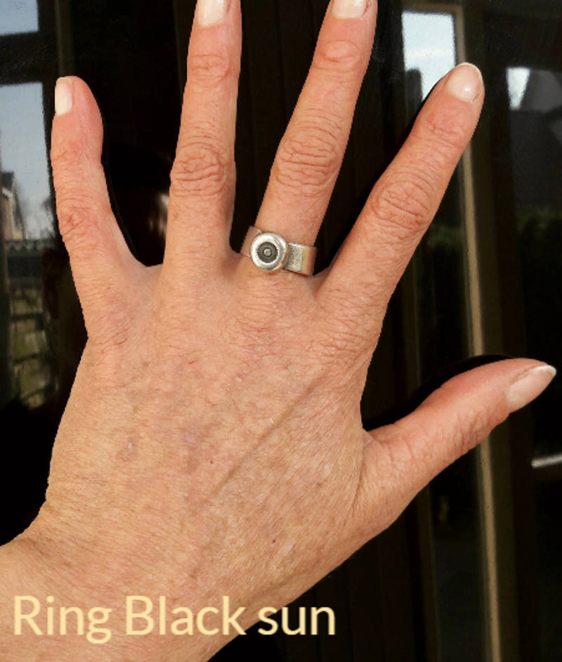 Ring van 99,9% zilver. De ringmaat is 17 of 19mm in diameter. Op bestelling kan een grotere maat gemaakt worden. de breedte van de ring is 10mm.