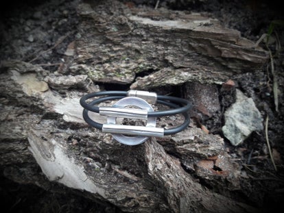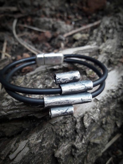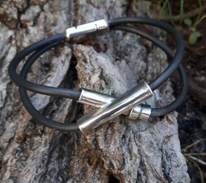 Zilveren armband met dubbele rubberen band erdoor heen. Rubber verkleurt niet dus blijft mooi zwart. Gemaakt van Art clay silver. Met zilveren magneetsluiting.